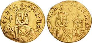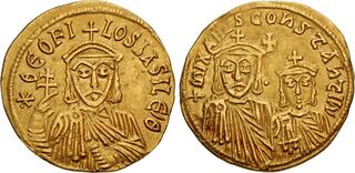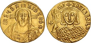 S-1696. Obverse: Facing bust of Michael III wearing crown and loros, holding globus cruciger; Reverse: Facing bust of Basil I wearing crown and chlamys, holding globus cruciger.