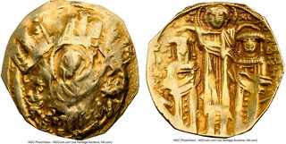 Andronicus II Palaeologus and Michael IX (AD 1294-1320). AV/EL hyperpyron (24mm, 2.40 gm, 5h). NGC Choice VF 3/5 - 2/5, scratches. Constantinople, AD 1325-1328. Nimbate bust of the Virgin, orans, within city walls furnished with four groups of towers / ANΔPONIC-ANΔIN, Christ standing facing (in center), blessing Andronicus II and Andronicus III, kneeling to left and right, respectively; their names around, IC-XC (barred) in fields. Sear 2461. www.HA.com/TexasAuctioneerLicenseNotice