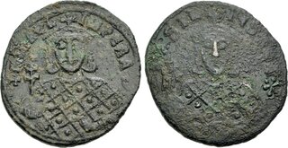 Crowned facing bust of Basil, holding akakia and globus surmounted by patriarchal cross.