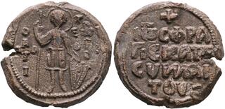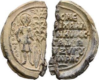Johannes Synnaites, 2nd half 12th century. Seal (Lead, 31 mm, 24.66 g, 12 h). O / A/Γ/I/O/C - Γ/ЄⲰP/ΓI/O/C Saint George, standing facing, nimbate, holding spear in his right hand, and resting left hand on a shield. Rev. IⲰ CΦPA/ΓICMA T૪ CVИИAI/TOV in four lines, cross above. Jordanov, Corpus II 651-652 and Corpus III 2037-2038. Wassiliou-Seibt, Corpus 1075. Light scuffs and minor breakage on the edge, otherwise, good very fine.