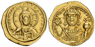 Rev: John standing facing, holding akakia and globus cruciger, and being crowned by Christ standing to right.