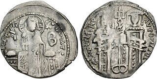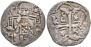 Andronicus II Palaeologus, with Andronicus III. 1282-1328. AR Basilikon (18mm, 1.42 g, 6h). Constantinople mint. Struck circa 6 June-October 1321. [...]IT OP´AT •, Christ Pantokrator, nimbate and draped, enthroned facing, raising right hand in benediction and holding Gospels in left hand; large B to right / [...]TEΓИIKO AVTOIΠIOC, Andronicus II and Andronicus III, both crowned and wearing loros, standing facing, together holding ornate labarum between them, held in their left and right hands r... | 13 Jan 2026 | 5,500 USD | |