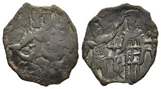 Michael (Stryphnos), grand doux and husband of Theodora, sister of the Empress, 1195-1203. Seal (Lead, 40 mm, 18.00 g, 12 h). O / Θ/Є/O/ΔⲰ/P/O/C - [O IAKINΘOC] Saint Theodore (on the left) and Saint Hyakinthos (on the right), standing on either side of a tree; Saint Theodore holding a spear in his right hand and resting his left hand on a shield set on the ground, Saint Hyakinthos (off flan) swinging an axe at the tree. Rev. [Δ૪KO]C MЄ/[ΓAΛ૪ M]IXAHΛ / [ΓPAΦⲰ]N KVPOC / [AVΓOV]CTAΔЄΛ/[ΦHC C]VZVΓ... | 6 Sep 2025 | 280 CHF | |
