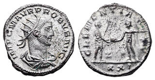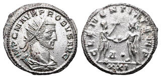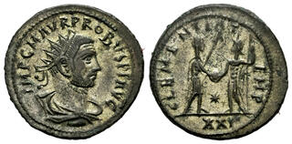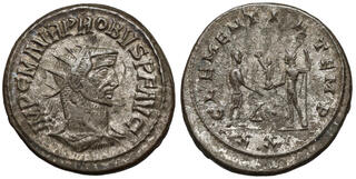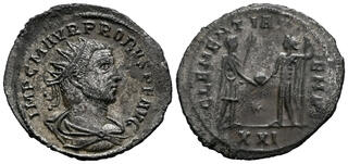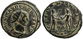 Obv: IMP C M AVR PROBVS AVG, radiate and draped bust right. Rev: CLEMENTIA TEMP, emperor standing right, holding sceptre surmounted by eagle, receiving globe from Jupiter, standing to left, holding sceptre; P between, XXI* in exergue.