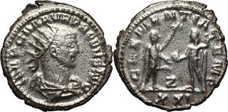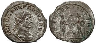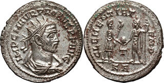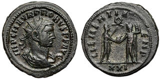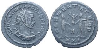 Reverse: Probus, standing right, holding sceptre, receiving globe from Jupiter, H between figures, XXI in exergue