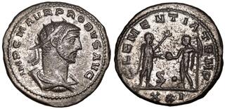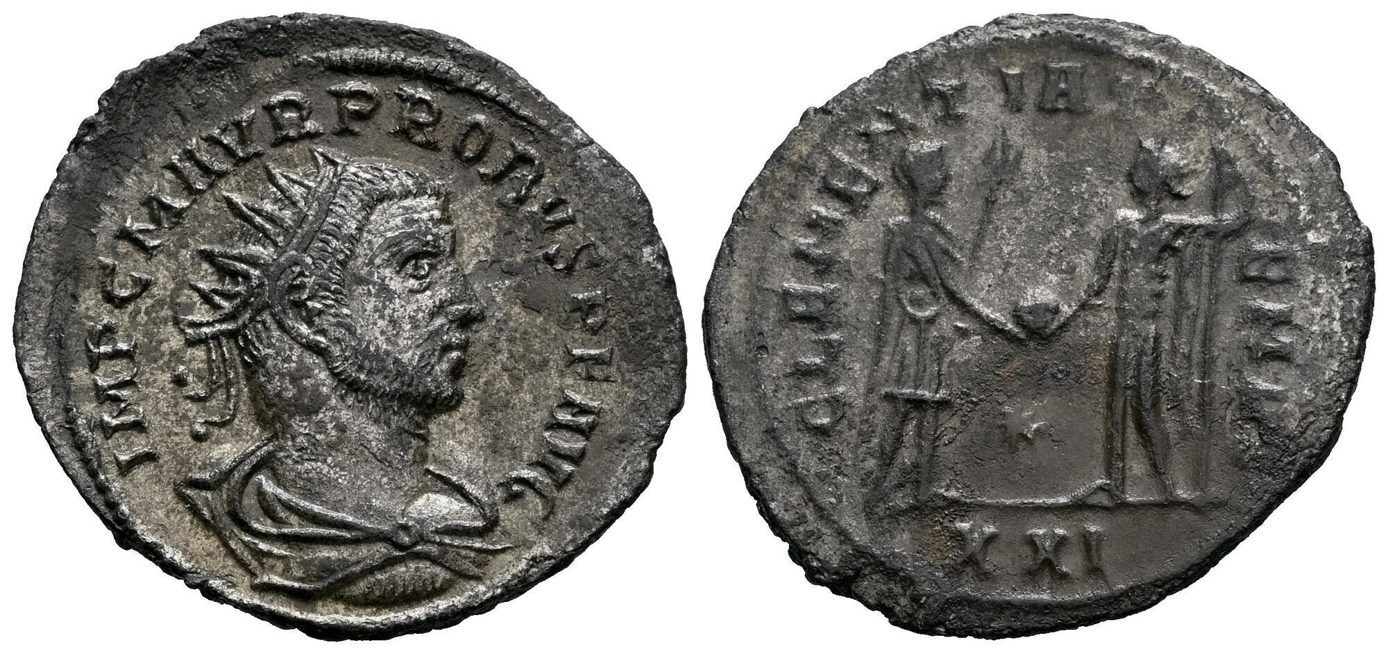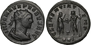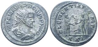 Obv: IMP C M AVR PROBVS AVG, radiate, draped and cuirassed bust right. Rev: CLEMENTIA TEMP, emperor standing right, holding sceptre and receiving globe from Jupiter standing left and holding sceptre; S• between, XXI in exergue.
