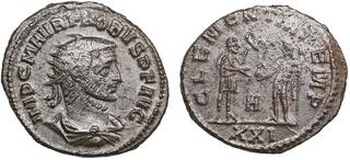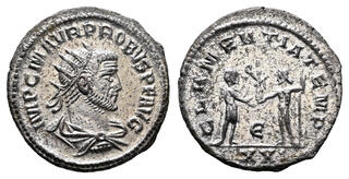 Obv: IMP C M AVR PROBVS AVG, radiate, draped and cuirassed bust right. Rev: CLEMENTIA TEMP, emperor standing right, holding sceptre and receiving globe from Jupiter standing left and holding sceptre; Γ between, XXI in exergue.