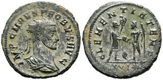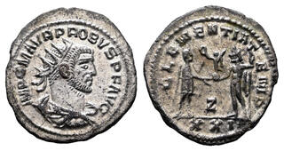 IMP C M AVR PROBVS AVG, radiate, draped and cuirassed bust to right / CLEMENTIA TEMP, emperor standing to right, holding sceptre and receiving Victory on globe from Jupiter standing to left and holding sceptre; Z• between, XXI in exergue.