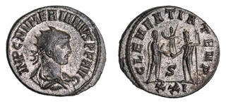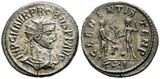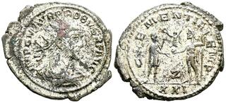 Waga 4,06 g, średnica 23 mm. Ładnie zachowany relief, sporo oryginalnego srebrzenia. Awers: popiersie Probusa w płaszczu i koronie promienistej w prawo, legenda IMP C M AVR PROBVS AVG. Rewers: Probus trzymający scipio (berło zwieńczone orłem) otrzymuje globus od stojącego po prawej stronie Jupitera, w polu między postaciami gwiazda, w otoku legenda CLEMENTIA TEMP, w odcinku KA.Reference: RIC 928