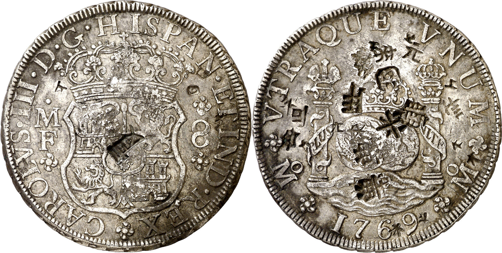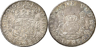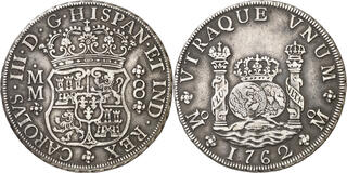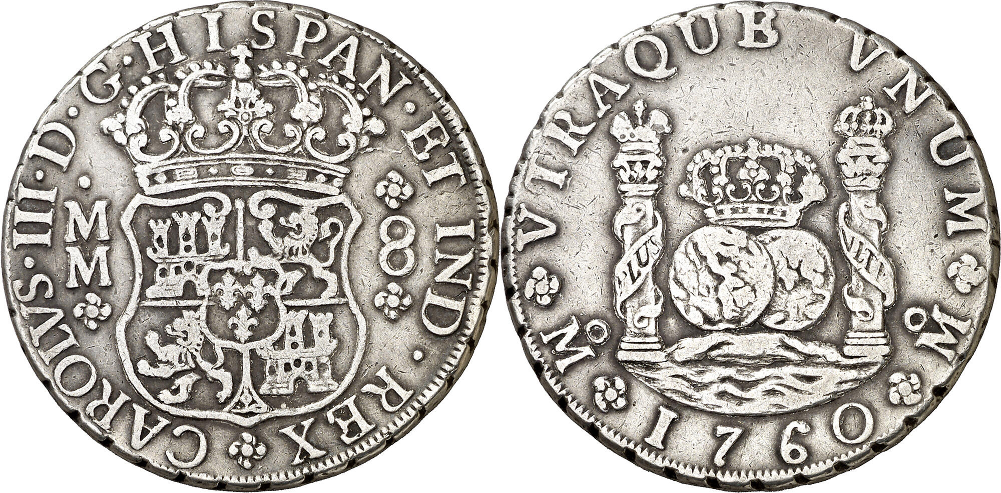 1761. Carlos III. Mexico. MM. 8 reales. (AC. 1075). Columnario type. Cross between H and I of HISPAN. Small dings. Nice patina. 26.86 g. EBC-/MBC+.