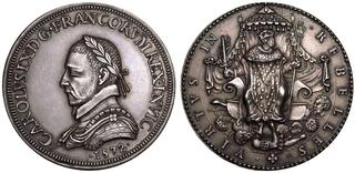 | Lot description: About Extremely Fine | FRANCE. Silver Medal, Possibly 18th century. unsigned [by G. Pilon & A. Olivier] Obv: CAROLVS IX·D G·FRANCORVM REX·INVIC, laureate, armoured and draped bust of Charles IX left, date below. Rev: VIRTVS IN REBELLES, king enthroned facing, head right beneath canopy. About Extremely Fine. Ex Noonans (formerly Dix Noonan Webb), Auction 282 (17th October 2023) Lot 267. Reference: CGMP-1-117. Weight: 18.60g. Diameter: 37mm. Composition: Silver. PLEASE NOTE: Raw coins sold as seen. We strongly encourage prospective buyers to inspect lots in person (by appointment) or to request additional images before bidding. A 22.50% buyer's premium will be charged separately. VAT on the buyer's premium may apply in accordance with UK regulations. Payment can be made in EUR, CHF, or USD for an exchange fee. Please contact us to find out more. Starting price: 1 GBP |