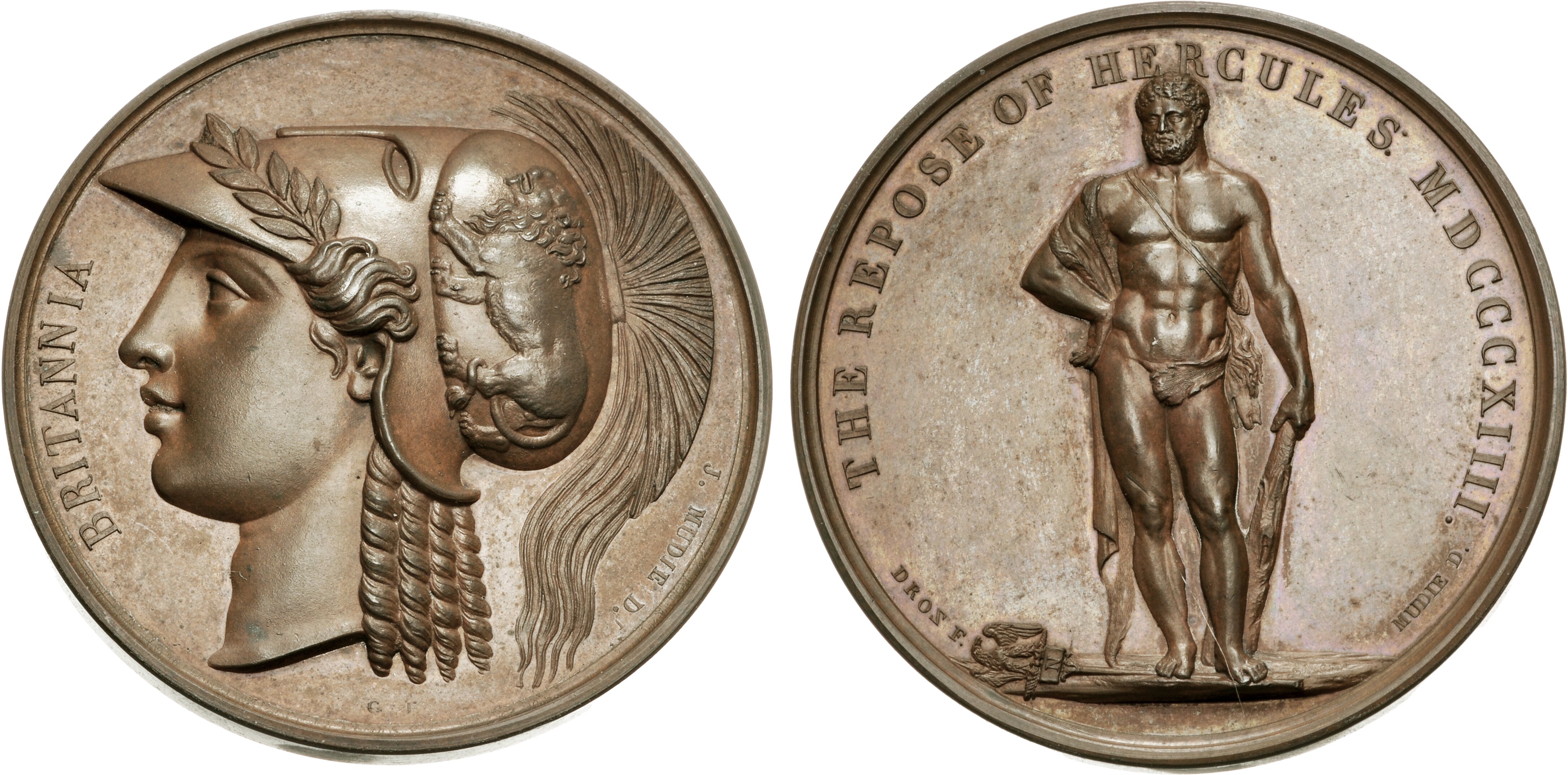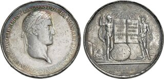 | Lot description: SPAIN, Kingdom. Fernando VII. Prisoniero, 1808-1813. AR Medal (55.5mm, 67.30 g, 12h). Constitution of Cádiz. By F. Sagau and D. de Galcerán. Dated 19 March 1812. · FERN · VII · POR LA G · DE DIOS Y LA CONST · DE LA MON · REY DE LAS ESPANAS, laureate head right / Spain, wearing crested Corinthian helmet and holding spear, and America, wearing feather headdress and holding bow, overflowing cornucopia at feet, both flanking open book set on two hemispheres and inscribed CONSTI/TUCI/ON/ POLITI/CA - DE LA. MONAR/QUIA/ ESPAÑO/LA; to left, lion seated left, head right and Pillars of Hercules inscribed PLVS ULT; to right, two ships under sail right; in exergue, PROMULGADA EN CADIZ/ A 19 DE MARZO DE/ 1812. Vives 292; CME 84. Iridescent toning, marks, scratches, hairlines. VF. From the Drewry Family Collection. Estimate: 100 USD |