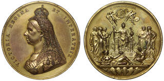 Golden Jubilee of Queen Victoria, 1887, gilt bronze medal by Sir Jospeh Edgar Boehm and Frederick, Lord Leighton, crowned and veiled bust left, J.E.B. incuse on truncation, VICTORIA REGINA ET IMPERATRIX, rev. enthroned figure of Empire facing, Mercury and Time at her feet, around her the figures of Science, Letters, Art, Industry and Agriculture, two cherubs above, IN. COMMEMORATION., diameter 78mm, weight 225g, with later non-Royal Mint blue case (BHM 3219; Eimer 1733a). Toned with multiple rim nicks and abrasion, gilding in fields wearing thin from past cleaning showing copper colour underneath, tinge of green to one part of reverse, handling marks, otherwise almost extremely fine, the gilding applied in the after-market along with the case which has a damp odour and a tear in the hinge of the lining.The Descriptive card that usually comes with this medallion elaborates further thus: In the centre a figure representing the British Empire sits enthroned, with the sea in the background, resting one hand on the sword of Justice, and holding in the other the symbol of victorious rule. A lion is seen on each side of the throne. At the feet of the seated figure lies Mercury, the God of Commerce, the mainstay of our imperial strength, holding up in one hand a cup heaped with gold. Opposite to him sits the Genius of Electricity and Steam. Below, again, five shields banded together bear the names of the five parts of the globe, Europe, Asia, Africa, America and Australasia, over which the Empire extends. On each side of the figure of Empire stand the personified elements of its greatness - on the right (of the spectator) Industry and Agriculture; on the left, Science, Letters, and Art. Above, the occasion of the celebration commemorated is expressed by two winged figures representing the year 1887 (the advancing figure), and the year 1837 (with averted head), holding each a wreath. Where these wreaths interlock the letters V. R. I. appear, and over all the words In Commemoration.The obverse legend translates as Victoria Queen and Empress. Lawrence Brown tells us in British Historical Medals 1760-1960, volume 2, that the issue of these medals began after the actual Golden Jubilee of 20th June, from the 18th July 1887 and sales of which continued until 26th February 1889. The gold and silver versions were struck at the Mint, but the bronze medal production was subcontracted to Ralph Heaton and Sons in Birmingham. The fine gold medal was priced originally at £13/13/-, the fine silver version at £2/2/- and the bronze at 10/6d. The official mintages are 944 in gold, 2,289 in silver and 4,257 in bronze.