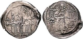 | Lot description: SERBIA. Stefan Uros V, as tsar, 1355-1371. Dinar (Silver, 20 mm, 0.77 g, 6 h). Φb - ZP Half-length figures of Stefan Uroš V and Anna of Wallachia standing facing. Anna is placing her right hand on her chest and Stefan is placing his left hand on his chest; between Stefan and Anna, large patriarchal cross. Rev. Christ, nimbate, seated facing on decorated throne and holding book of Gospels with both hands. Jovanovic (SMC) 12-30.4. Nicely toned. Some areas of weakness and light doubling, otherwise, very fine. Starting price: 25 CHF |