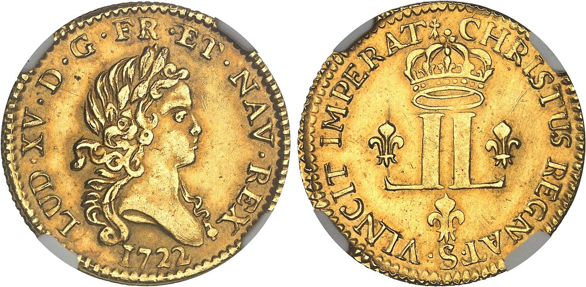 Av. LVD. XV. D. G. FR. ET. NAV. REX (différent). Buste nu, lauré, du Roi à droite ; (date) au-dessous.