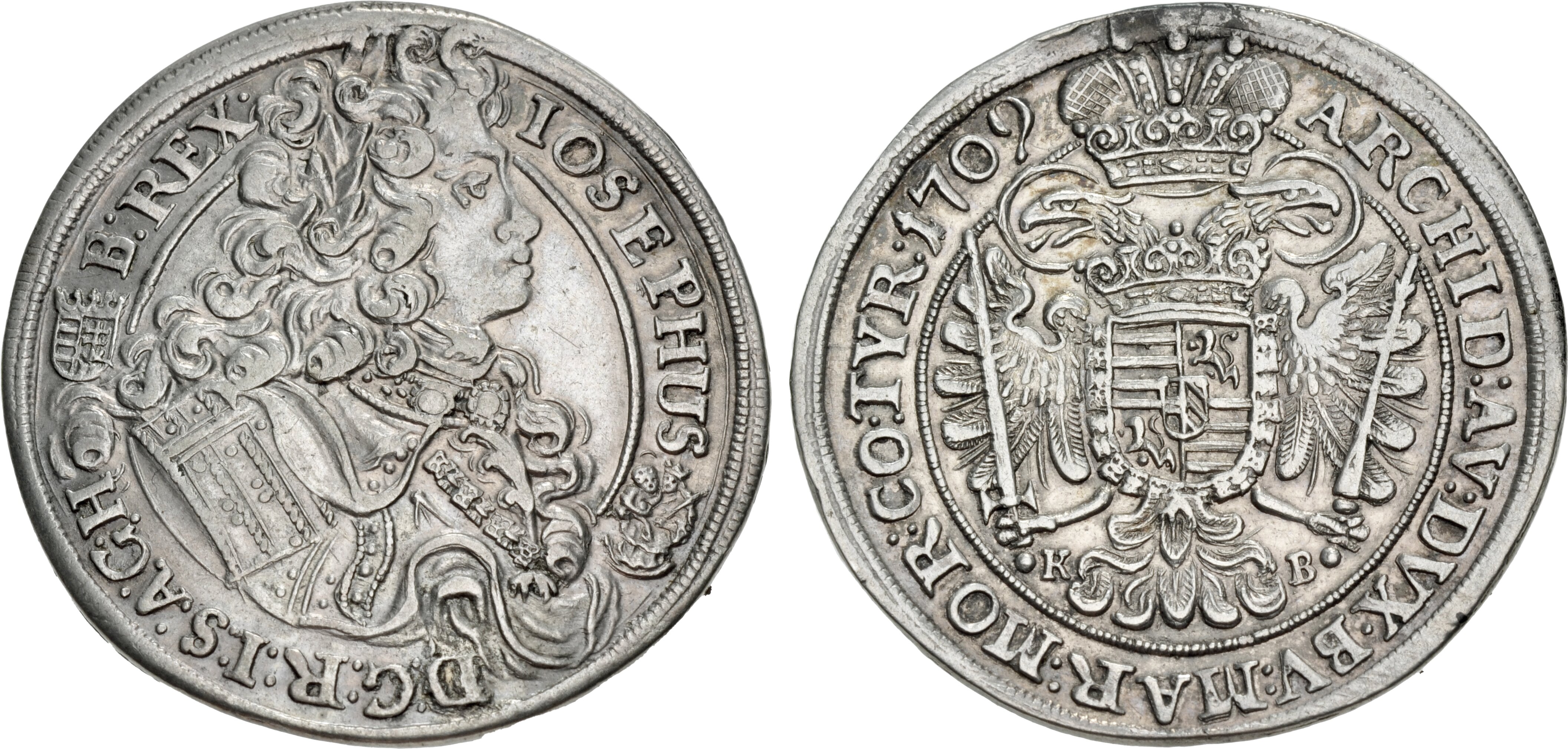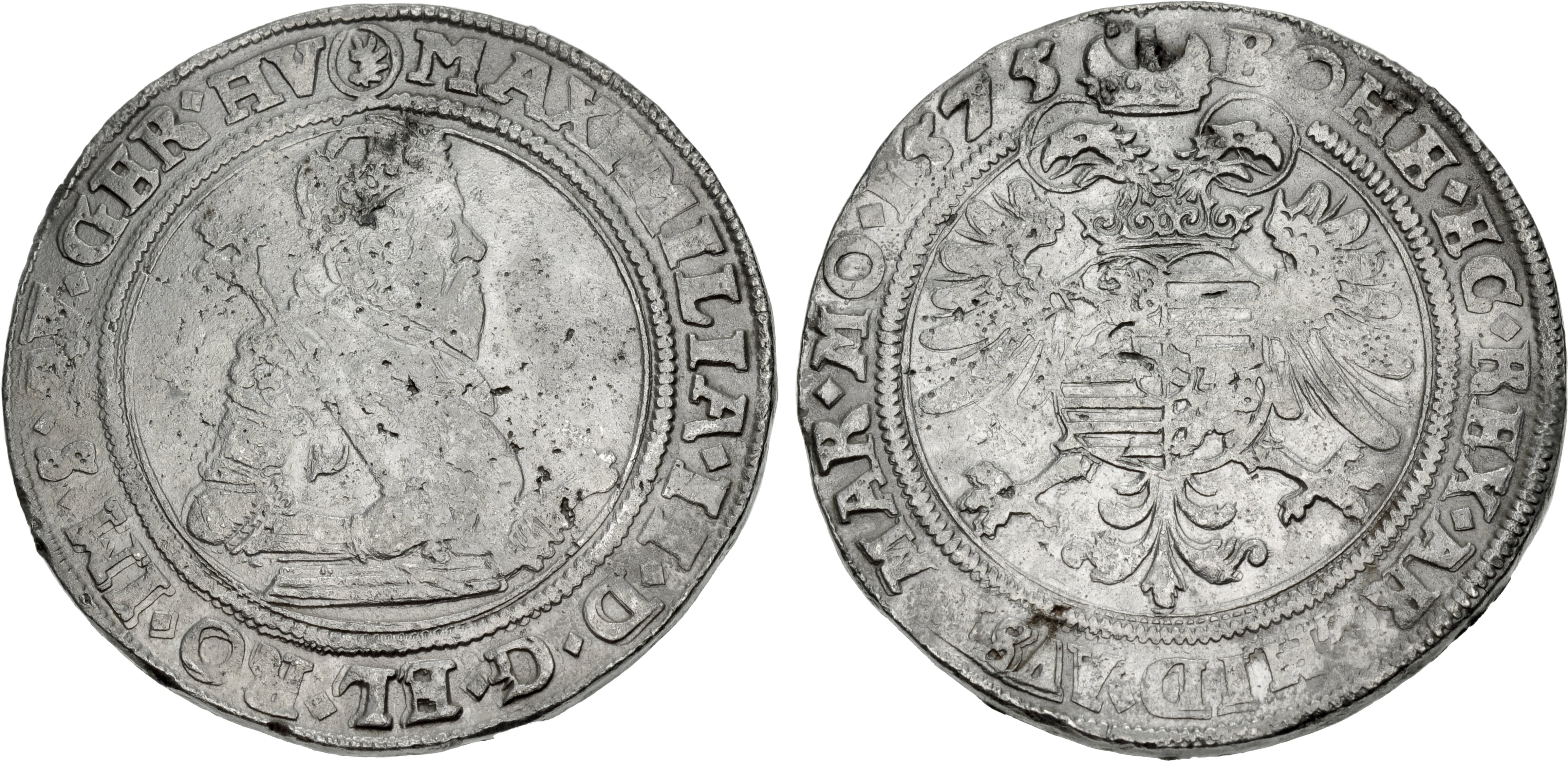 AUSTRIA, Holy Roman Empire. Maximilian II. Emperor, 1564-1576. AR Taler (41mm, 27.89 g, 10h). Kuttenberg mint. Dated 1575. Crowned and armored bust right, holding scepter over shoulder and resting hand on sword hilt / Crowned double-headed eagle facing with wings spread; crowned coat-of-arms on breast. Voglhuber 68; Davenport 8056. Toned, light porosity, minor deposits, small edge marks. Near VF.