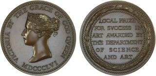 | Lot description: GREAT BRITAIN: Victoria, 1837-1901, AE medal (74.81g), 1856, Eimer-1511, 55mm bronze award medal of the Department of Science and Art, by W. Wyon, crowned bust left with VICTORIA BY THE GRACE OF GOD QVEEN - MDCCCLVI around // LOCAL PRIZE / FOR SVCCESS IN / ART AWARDED BY / THE DEPARTMENT / OF SCIENCE / AND ART within beaded circle, all within laurel wreath with another beaded circle as the border, tiny reverse spot, brown, FREDERICK W. RICH.NEWCASTLE-ON-TYNE.STAGE 15. and "1857" on edge, Choice Unc. Estimate: 100 - 150 USD |