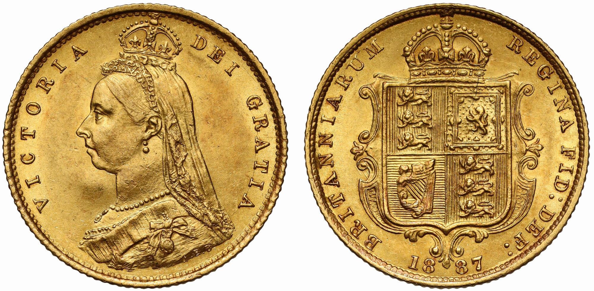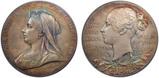 | Lot description: GREAT BRITAIN: Victoria, 1837-1901, AR medal, 1897, BHM-3506, Eimer-1817a, 56mm silver medal by G. W. de Saulles, after T. Brock and W. Wyon for the Diamond Jubilee of Queen Victoria; crowned, draped, and veiled old bust left with VICTORIA ANNVM REGNI SEXAGESIMVM FELICITER CLAVDIT XX IVN MDCCCXCVII around // young head bust left with LONGI- / -TUDO / DIERVM / IN / DEXTERA / EIVS to left and ET IN / SINISTRA / GLORIA to right with laurel branch below and "1897" at bottom, plain edge, with original case of issue, a wonderful lightly toned specimen quality example, PCGS graded Specimen 64. Estimate: 150 - 250 USD |