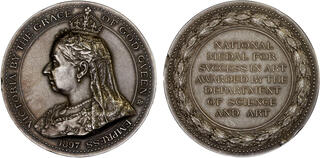 | Lot description: GREAT BRITAIN: Victoria, 1837-1901, AR medal (85.53g), 1897, Eimer-1825, 51mm silver award medal for the Department of Science and Art (Queen's National Medal) by F. Bowcher, veiled, crowned, and draped bust of Victoria with "VICTORIA BY THE GRACE - OF GOD QVEEN & - EMPRESS - 1897" around // NATIONAL / MEDAL FOR / SVCCESS IN ART / AWARDED BY THE / DEPARTMENT / OF SCIENCE / AND ART within inner circle with laurel wreath around, a few small rim nicks, in original plush broken box, "JAMES McKISSACK, SUBJECT 23b 1897." on edge, Unc. Estimate: 110 - 160 USD |