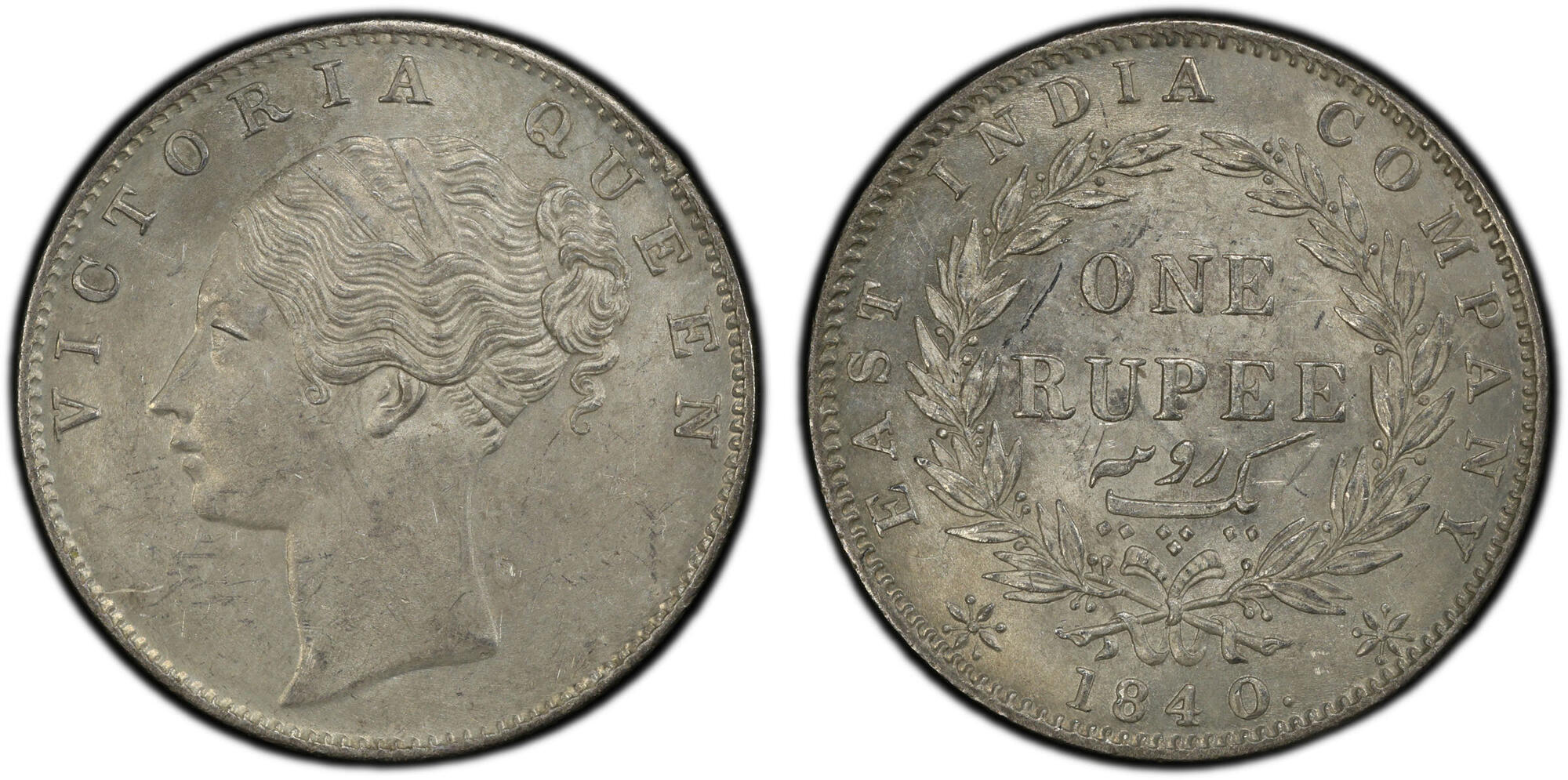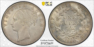BRITISH INDIA: Victoria, Queen, 1837-1876, AR rupee, 1840(c), KM-457.10, Prid-53, S&W-2.16, the so-called "Indian head" variety, with crescent on left ribbon bow, PCGS graded MS62, ex Pridmore Collection.