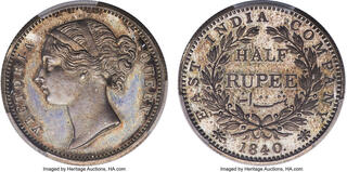 British India. Victoria Proof Early Restrike Mule 1/2 Rupee 1840-(b&c) PR64 PCGS, Bombay or Calcutta mint, KM-B455, S&W-3.47, Prid-81. Early Restrike. Type II/I Mule. This tremendous Early Proof Restrike of the "divided legend" 1/2 Rupee dated 1840 boasts an incredible lineage. The present near-Gem specimen once resided in three legendary collections; first with Virgil Brand (a famous American collector), then with Pridmore, and most recently with Puddester. For a coin to possess any of these three major collections as provenance would be noteworthy; to claim all three is quite astounding.