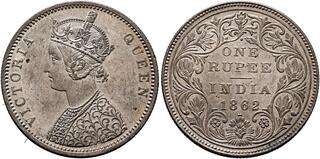 INDIA, Colonial. British India. Victoria, 1837-1901. Rupee 1862 B (Silver, 31 mm, 11.69 g, 12 h), Type A/II 1/2, variety with one dot above and two dots below legend on reverse. Bombay (Mumbai). VICTORIA - QUEEN Crowned bust of Victoria to left. Rev. ONE / RUPEE / INDIA / 1862 within a wreath made of roses, thistle and lotus flowers. KM 473.1. Pridmore 103. Nicely toned. Stained, otherwise, good extremely fine.