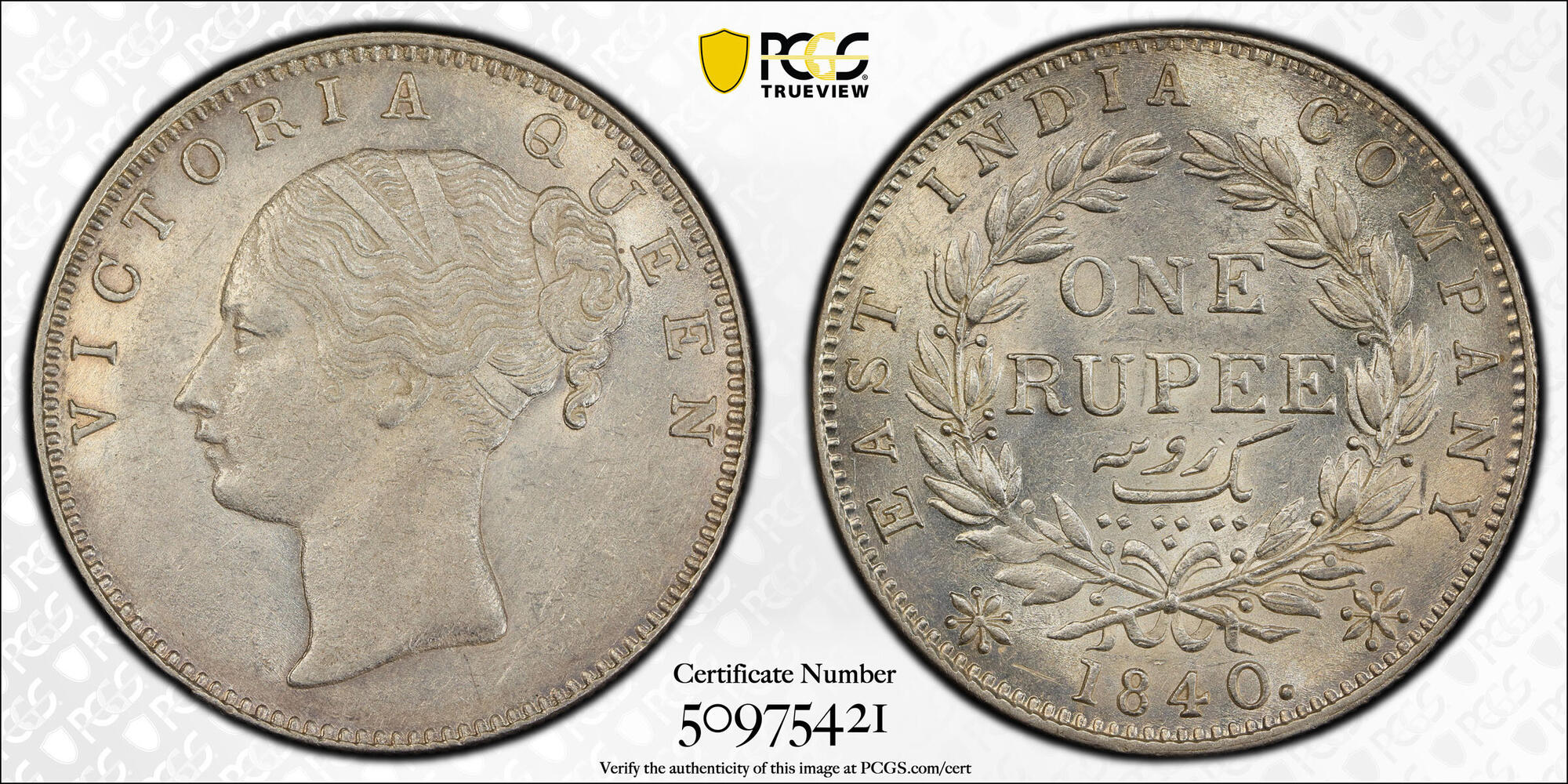 BRITISH INDIA: Victoria, Queen, 1837-1876, AR rupee, 1840(c), KM-457.1, S&W-2.13, East India Company issue, continuous legend type, a pleasing mint state example, PCGS graded MS62.