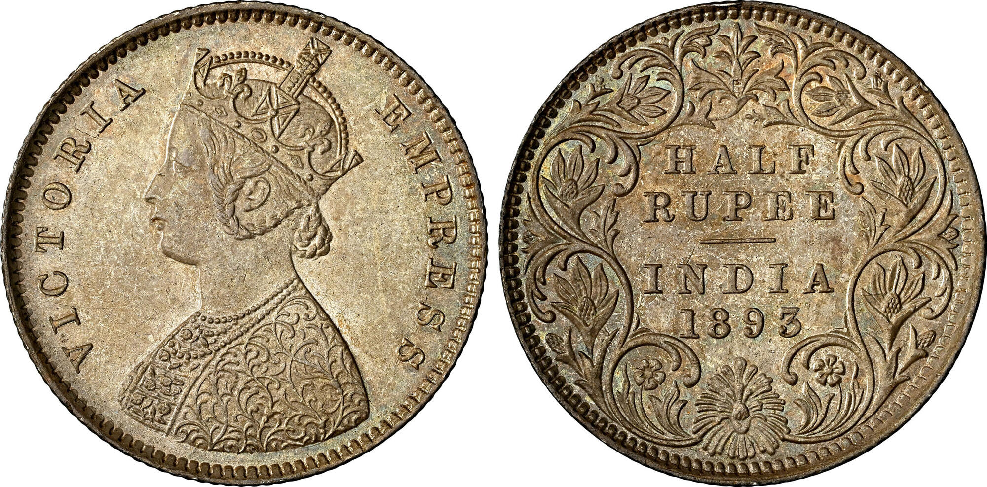 BRITISH INDIA: Victoria, Empress, 1876-1901, AR 1/2 rupee, 1893-B, KM-491, S&W-6.220, incuse B, a wonderful mint state example! NGC graded MS64, ex Robert P. Puddester Collection.