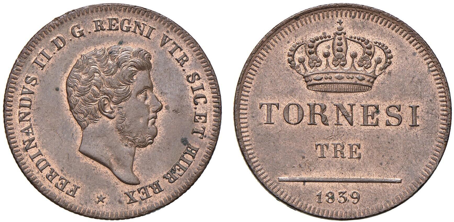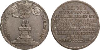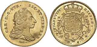 Dr. CAR: D :G: REX NEA - HISP : INFANS• &C:. Stemma coronato; ai lati, F - B / [A]. Rv. DE SOCIO PRINCEPS. Sebeto sdraiato; sullo sfondo, il Vesuvio; in esergo, data tra De/G.