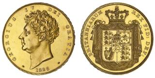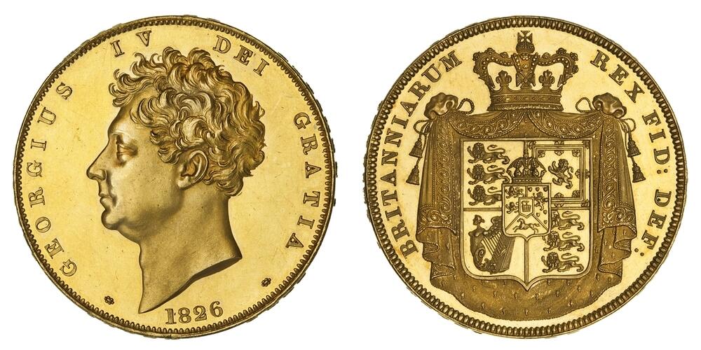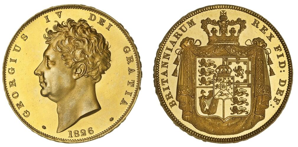 The Morning Post (27 October 1826), reports: 'A new coinage of gold, silver and copper has just been completed at the Mint. Four or Five of the principal bankers had each one set as a specimen, and no more. A set consists of one 5l. piece, one 2l. piece, a 1l. piece, and a 10s. piece (gold); a 5s. piece, a half-crown piece, a 1s and a 6d. (silver); a penny, a half-penny, and a farthing in copper. The 5l. piece bears on one side the arms of Great Britain engraved on drapery, with the motto DECUS ET TUTAMEN, and the date of the year: on the other side, the head of His Majesty, similar to the one on the new Sovereign. This piece is supposed to be taken from the forty Liri piece of Parma. The 2l. piece is the same as the above; the 1l. piece is also the same, but not engraved on drapery. The 5s. piece, the half-crown piece, the 1s. and 6d. bear the arms of Great Britain, the same as these already issued. The penny, half-penny and farthing, dated 1826.