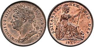 BRITISH, Hanover. George IV, 1820-1830. Farthing (Copper, 22 mm, 4.63 g, 6 h), First Issue, London, 1825. GEORGIUS IIII - DEI GRATIA. Laureate and draped bust of King George IV to left. Rev. BRITANNIAR: REX FID: DEF: Seated figure of Britannia to right with lion at her feet, trident in her left hand, shield with Union flag and olive branch in her right, date in exergue. SCBC 3822. Fresh and lustrous. Virtually as struck.