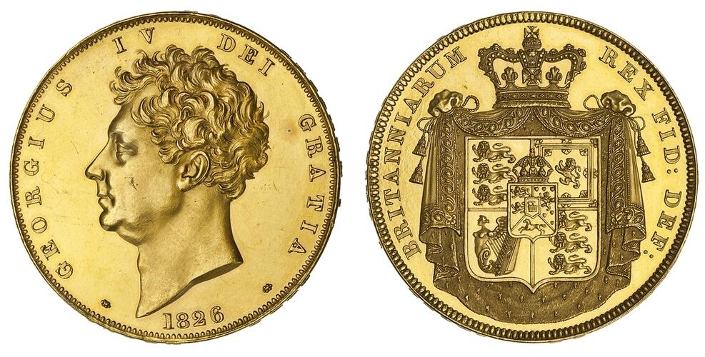 (g) George IV (1820-1830), Specimen Plain Edge Five Pounds, 1826, 'Low 6', hot-struck in Experimental 22ct Binary "Yellow Gold" Alloy from Refurbished Proof Dies [c. 1827], GEORGIUS IV DEI GRATIA, bare head left, rev. BRITANNIARUM REX FID: DEF:, crowned shield in mantle, seven semée of hearts, edge plain, 39.797g [614.16grains], 6h (Hill F7; L&S 26; Hocking -; Douglas-Morris 170 [46.515g]; May 277 = Murdoch 363 = Nobleman 117 = Newcomer = "Traveller" 2151 [39.89g]; W&R 214 [R6]), minor wisps in otherwise sumptuously brilliant fields, with characteristic "orange-peeling" from Mint annealing processes; an exquisite and choice "VIP" Pattern, as if 'fresh from the die', OF THE HIGHEST RARITY with only THREE documented; unquestionably one of the most significant numismatic offerings to appear at public commerce in Britain; this being the influential 'trend-setter' for the metallic composition, dimension and subsequent global popularisation of the Five Sovereign Piece amongst cognoscente for nigh 200 years, proudly offered by Spink on the eve of its Bicentennial and with a most prestigious pedigree from the cabinet of a Senior Royal Mint Official, in NGC Black 'Pallas' holder, erroneously certified (Cert. #8534310-004).