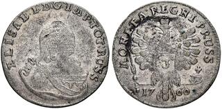 3 Gröscher 1760, Königsberg Mint. Mintage for Prussia during the Seven Years' War. Small date. 1.45 g. Diakov 687 (R3). Bitkin 757 (R2). Olding 456. Sehr selten / Very rare. 25 roubles according to Petrov. 15 roubles according to Ilyin. Mit Prägeglanz / With mint luster. Vorzüglich / Extremely Fine.