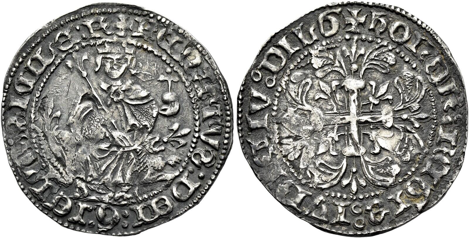 | Lot description: The House of Valois-Anjou Renée of Anjou, 1435 – 1442, claimant to 1480. Gigliato (1436-1440), AR 3.37 g. + RENATVS (S inverted) DEI GR IE...S(inverted)ICILIE R The King seated facing on throne flanked by lions' foreparts, holding lis-tipped sceptre and globus cruciger; the lions at side of throne have a lis in their jaws. Rev. hONOR REGIS IVDICIV DILG Cross fleurée, with lis in each quarter. Sambon, Gli Angioini della 2a stirpe, p. 217, 1 var. (ONOR...DILIGIT). CNI XIX, 52.1 var (DILIGIT). Pannuti-Riccio 1var. (DILIGIT). MEC XIV, p. 253 type 1a. MIR 49/1var. (DILIGIT). Of the highest rarity, only three specimens known: His Majesty collection (CNI 1, possibly ex Marignoli collection), another with a slightly different legend in the Museum of Marseille. (Sambon, op. cit., 1, note 1.) and ours, the only one in private hands. All have different dies. CNI XIX, 52. 2 and Sambon, op. cit., describe a variant without the lis at the mouth of the lions. Old cabinet tone and about extremely fine Renée of Anjou (1409–1480) was a member of the House of Valois -Anjou, a cadet branch of the French royal house, and the great-grandson John II the Good, king of France. He became a prominent claimant to the Kingdom of Naples due to his maternal connection to the Neapolitan royal family. His mother, Yolande of Aragon, was the daughter of King Ferdinand I of Aragon, and Renée's paternal grandfather was King Louis II of Anjou. Renée 's claim to the Neapolitan throne stemmed from the Angevin legacy in Naples, which had been established by his ancestors. After the death of his cousin, Queen Joan II of Naples, in 1435, the Kingdom of Naples became embroiled in dynastic conflict. Renée's claim was contested by the Aragonese, who had seized the throne under Alfonso V of Aragon in 1442. Despite his royal blood, Renato was never able to secure the throne of Naples. Throughout his life, Renée was involved in various political and military endeavours to assert his claim. He spent much of his time in southern Italy and France, attempting to rally support among his allies. However, due to the dominance of the Aragonese dynasty in Naples and the complex political dynamics of the time, Renée's efforts were ultimately unsuccessful. Renée of Anjou is remembered for his determination to reclaim Naples, but also for his broader role in European politics during the 15th century. He held various titles, including that of Duke of Anjou, and was a patron of the arts and letters, making him an important figure in both the political and cultural spheres of his time. Estimate: 50000 CHF |