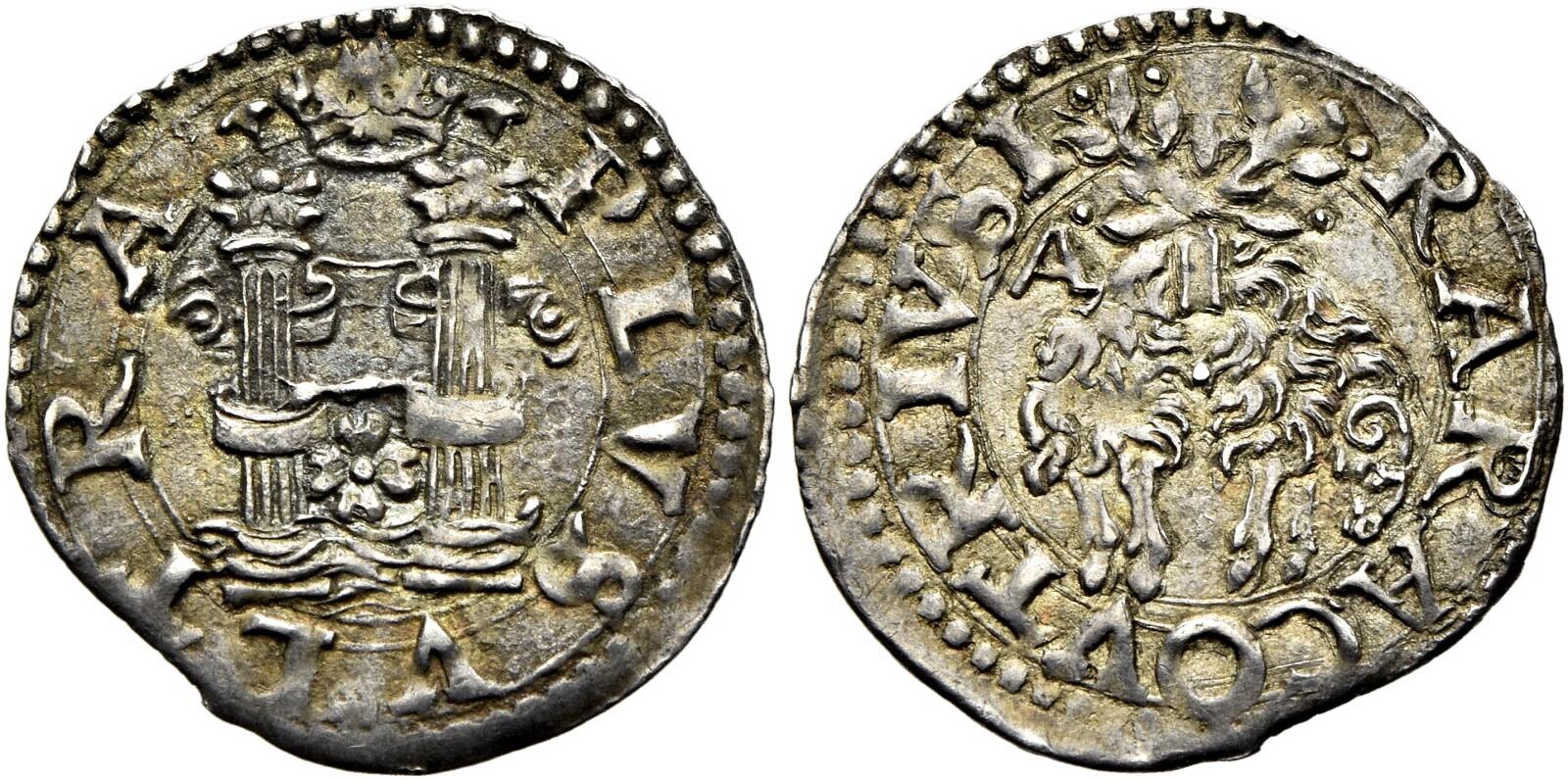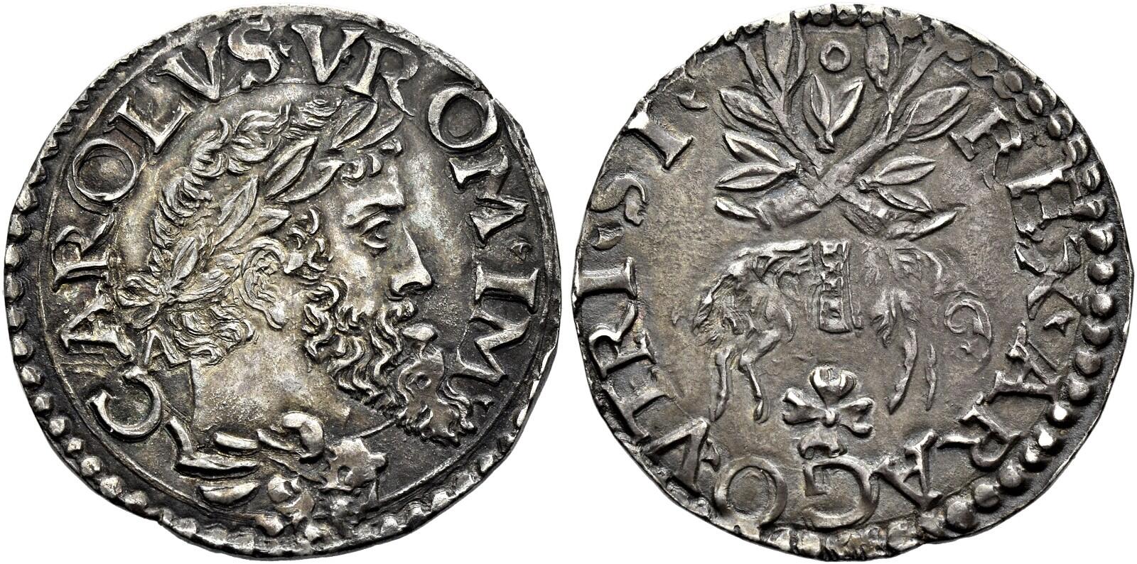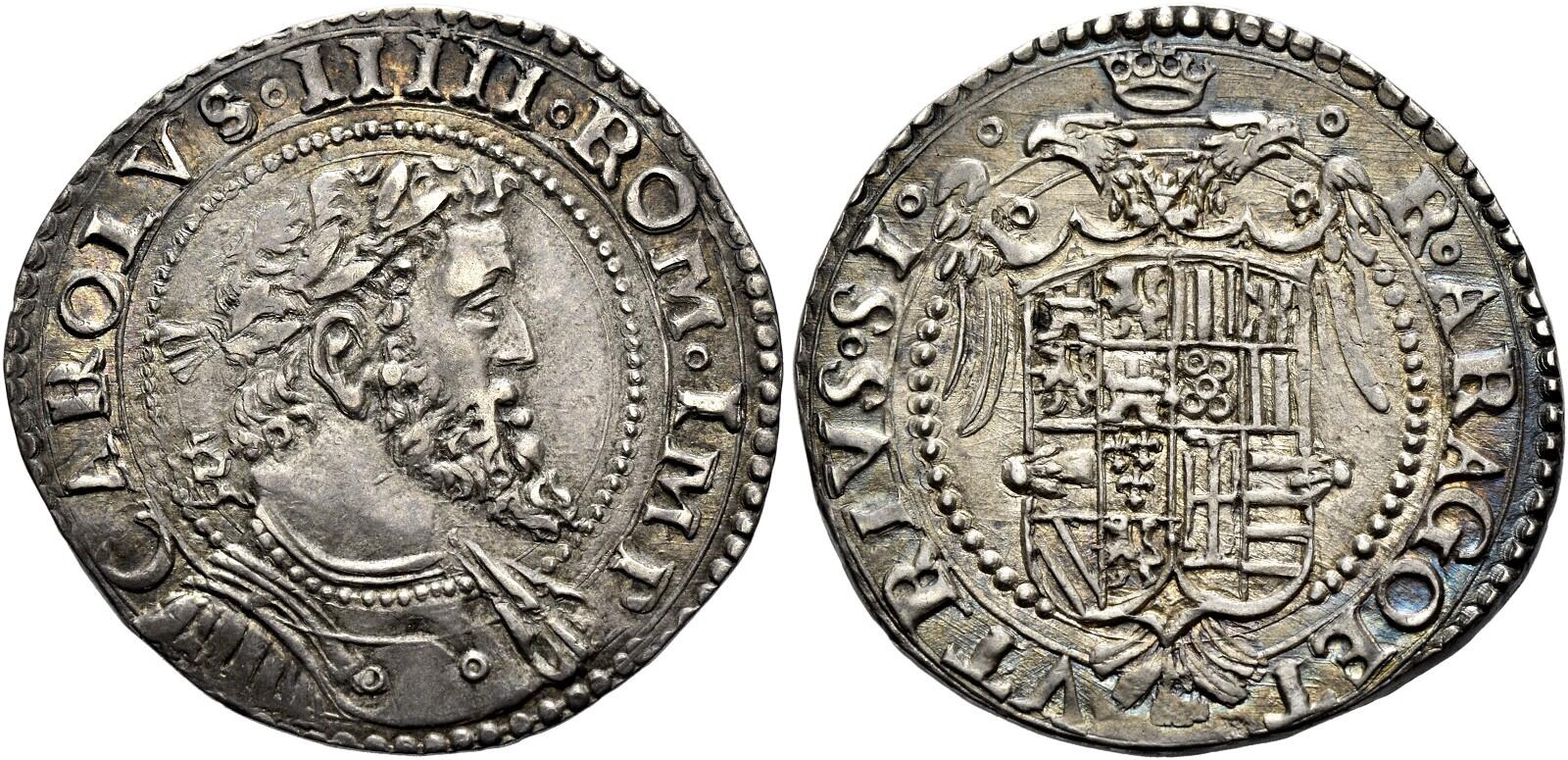 Scudo (from 1548), AV 3.37 g. CAROLVS IIIII RO IMP Laureate head r., with drapery at side of neck; behind, IBR ligate (Giovan Battista Ravaschieri, mint master 1548-1567) and beneath, leaf and annulet. Rev. R ARAG – VTRIVS Spanish coat of arms set on a crowned double-headed eagle with outspread wings. Pannuti-Riccio 9. MIR 131. Magliocca 20. Friedberg 834.