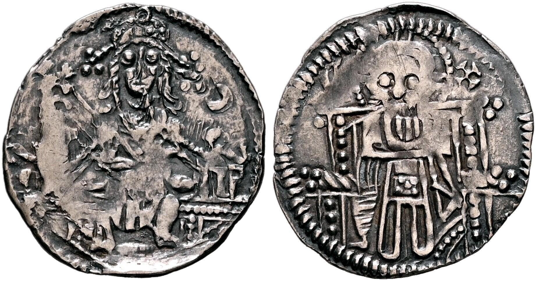 | Lot description: SERBIA. Stefan Uros V, as tsar, 1355-1371. Half Dinar (Silver, 16 mm, 0.84 g, 4 h). [Φb - ZP] Half-length figures of Stefan Uroš V and Anna of Wallachia standing facing; between them, large patriarchal cross. Rev. IC - XC Christ, nimbate, seated facing on decorated throne and holding book of Gospels with both hands; below the left elbow of Christ, mintmark o. Jovanovic (SMC) 12-35.4. Nicely toned. Areas of weakness and small edge defects, otherwise, nearly very fine. Starting price: 25 CHF |
