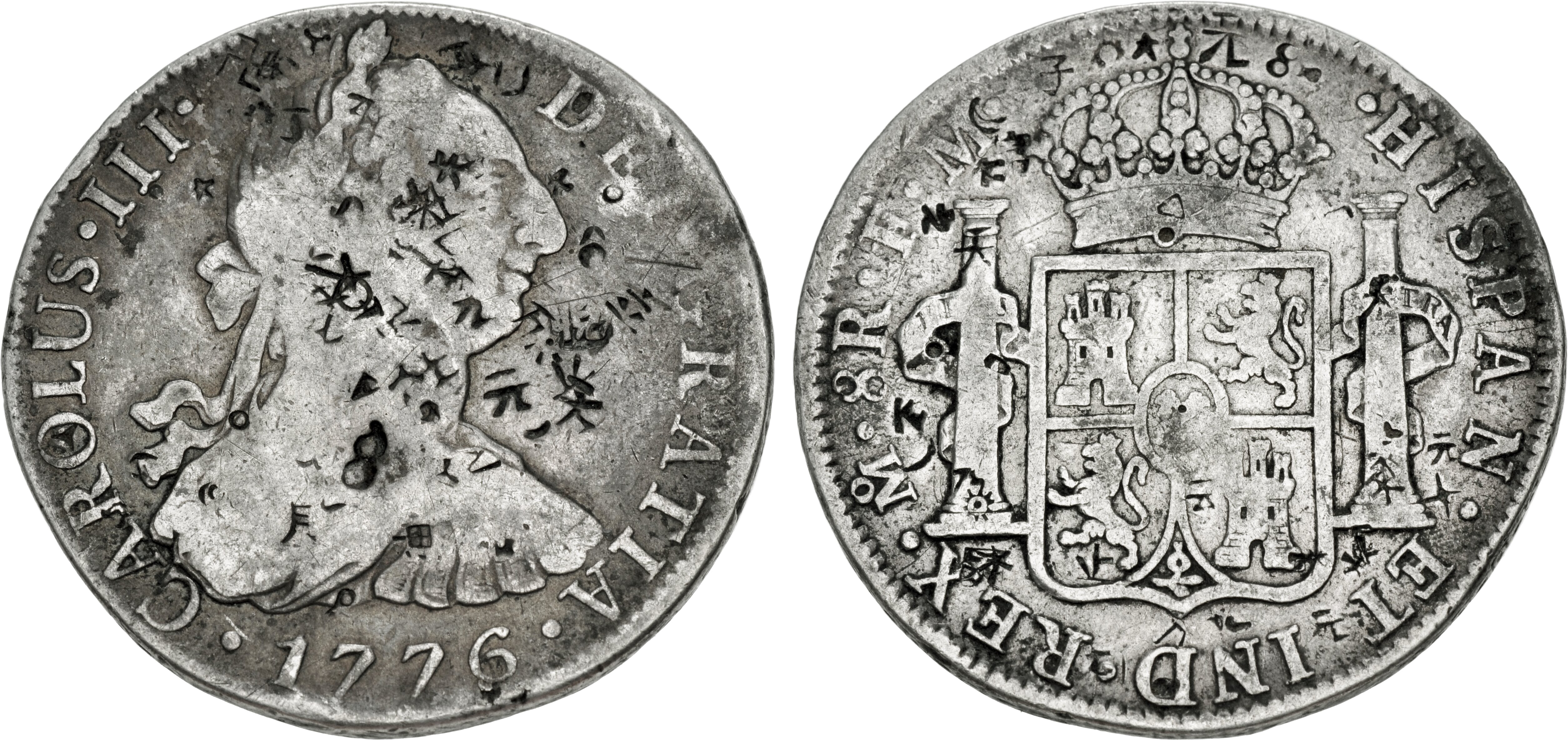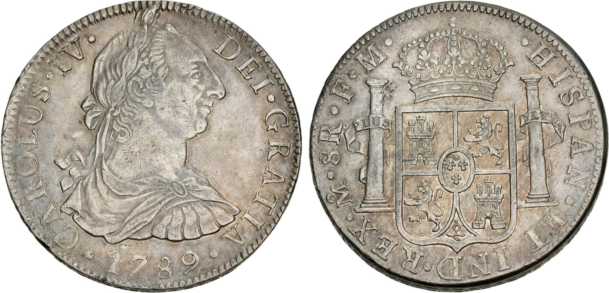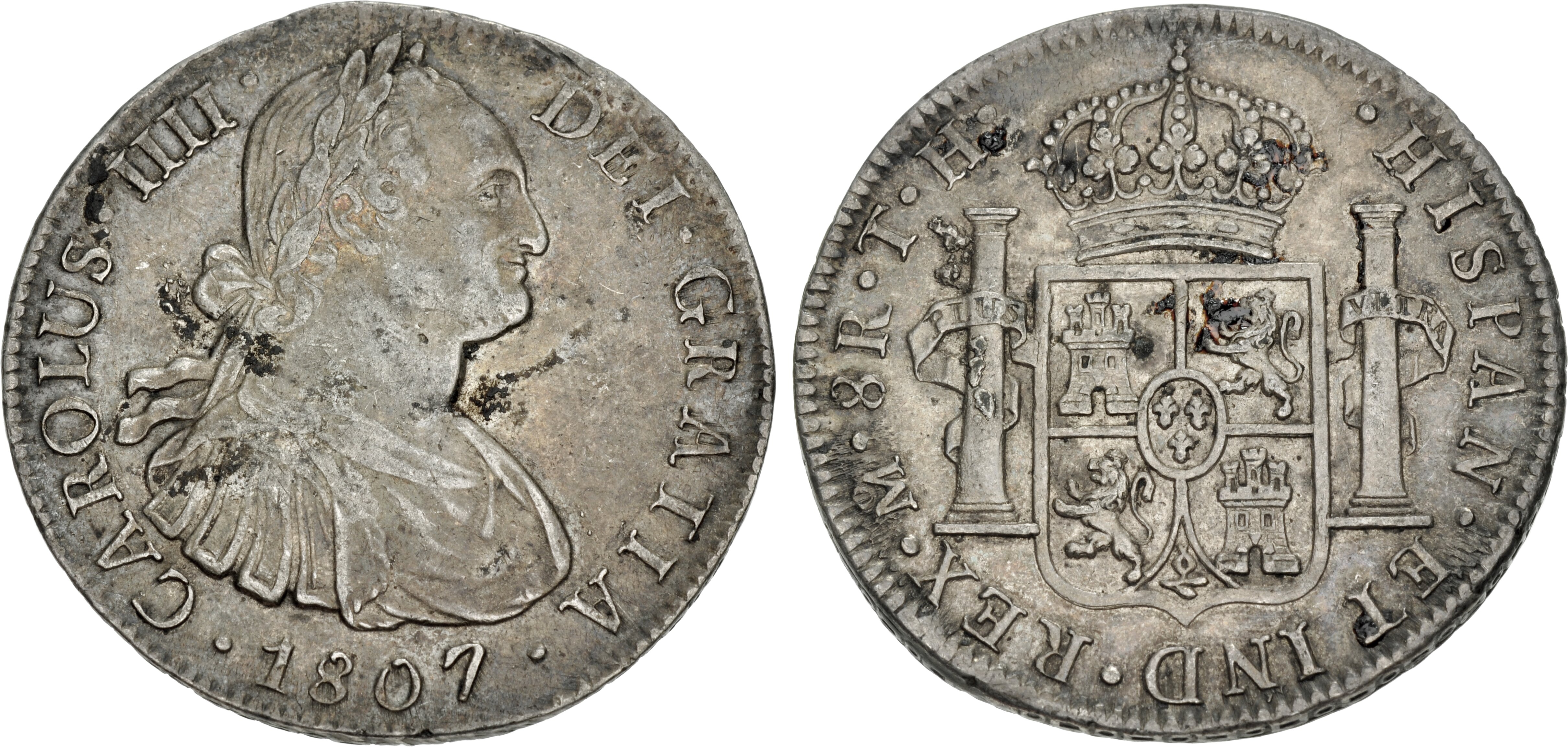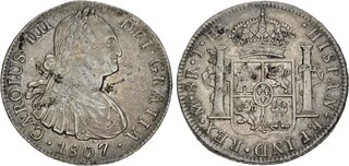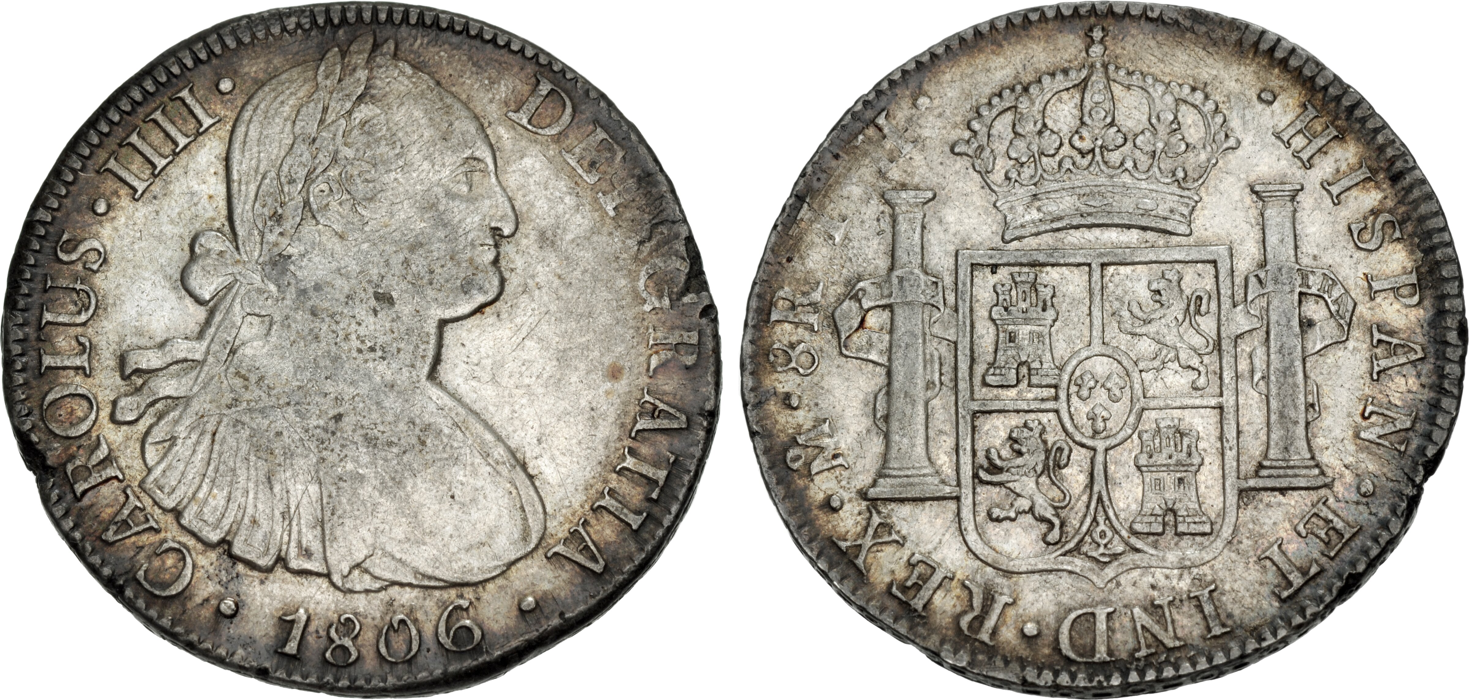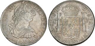PERU, Colonial. Carlos IV, king of Spain, 1788-1808. 2 Reales 1808 (Silver, 27 mm, 6.31 g, 12 h), Lima. CAROLUS•IIII• - DEI•GRATIA Laureate and cuirassed bust of Charles IV right, below •1808•. Rev. •HISPAN•ET IND•REX•(LIMAE in monogram) •2R•J•P• Crowned arms between the Pillars of Hercules. Calicó 594. KM 95. Beautifully toned. Very minor scratches and edge faults, otherwise, very fine.