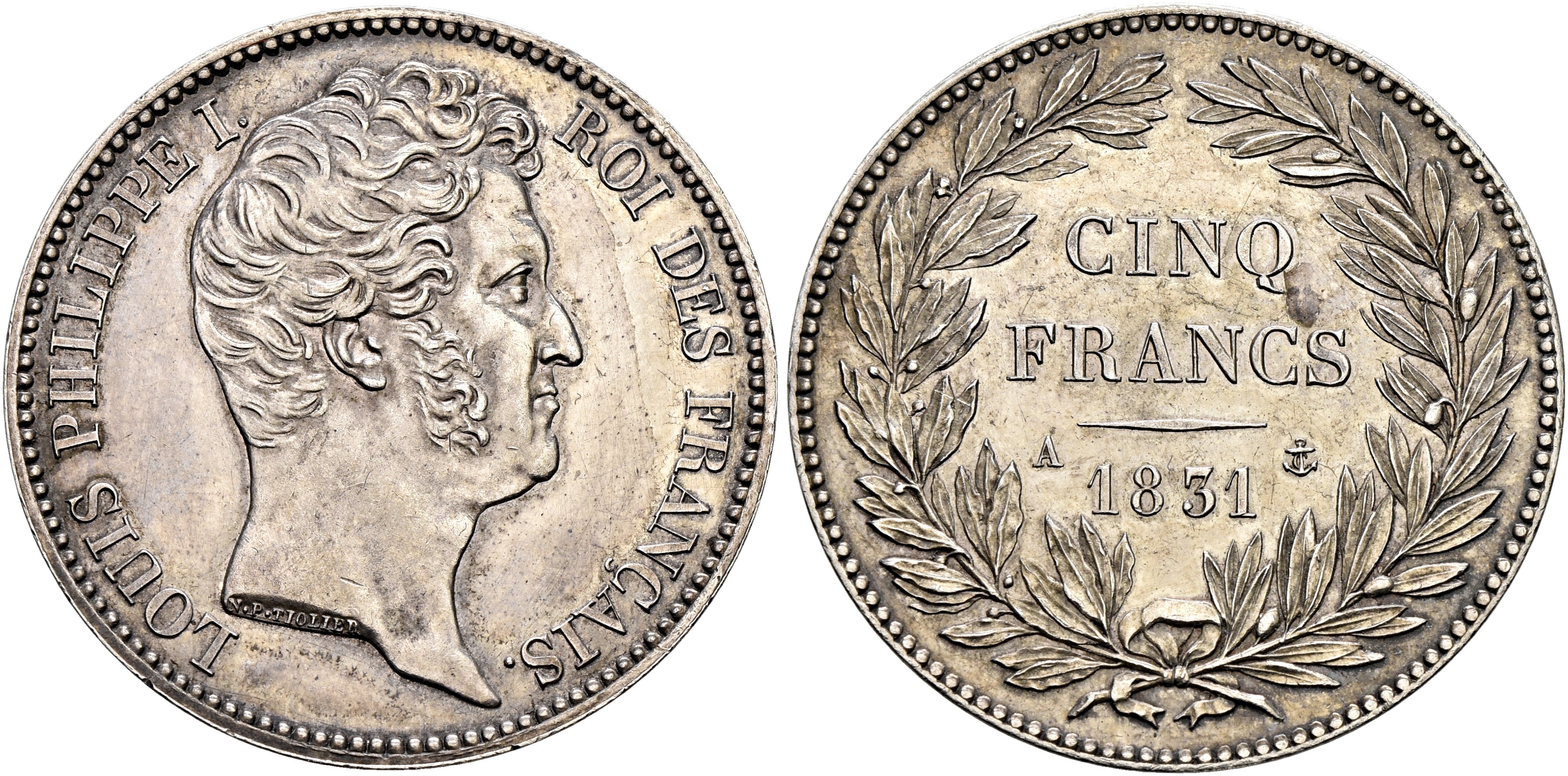 Louis Philippe, 1830-1848. 5 Francs 1831 A, Paris. Probe in Silber / Essai en argent. LOUIS PHILIPPE I. - ROI DES FRANÇAIS. Kopf nach rechts, auf dem Halsabschnitt N.P.TIOLIER Rv. CINQ / FRANCS / Linie / A - 1831 - (Anker), zwischen Lorbeerzeigen. Glatter Rand. 24.74 g. Gadoury 670 (Zinn). Mazard 1079 (Zinn). V.G. 2774 (Zinn) und 2781. Äusserst selten / Extremely rare. Reste von Zaponlack / Traces of lacquer. Vorzüglich / Extremely Fine.