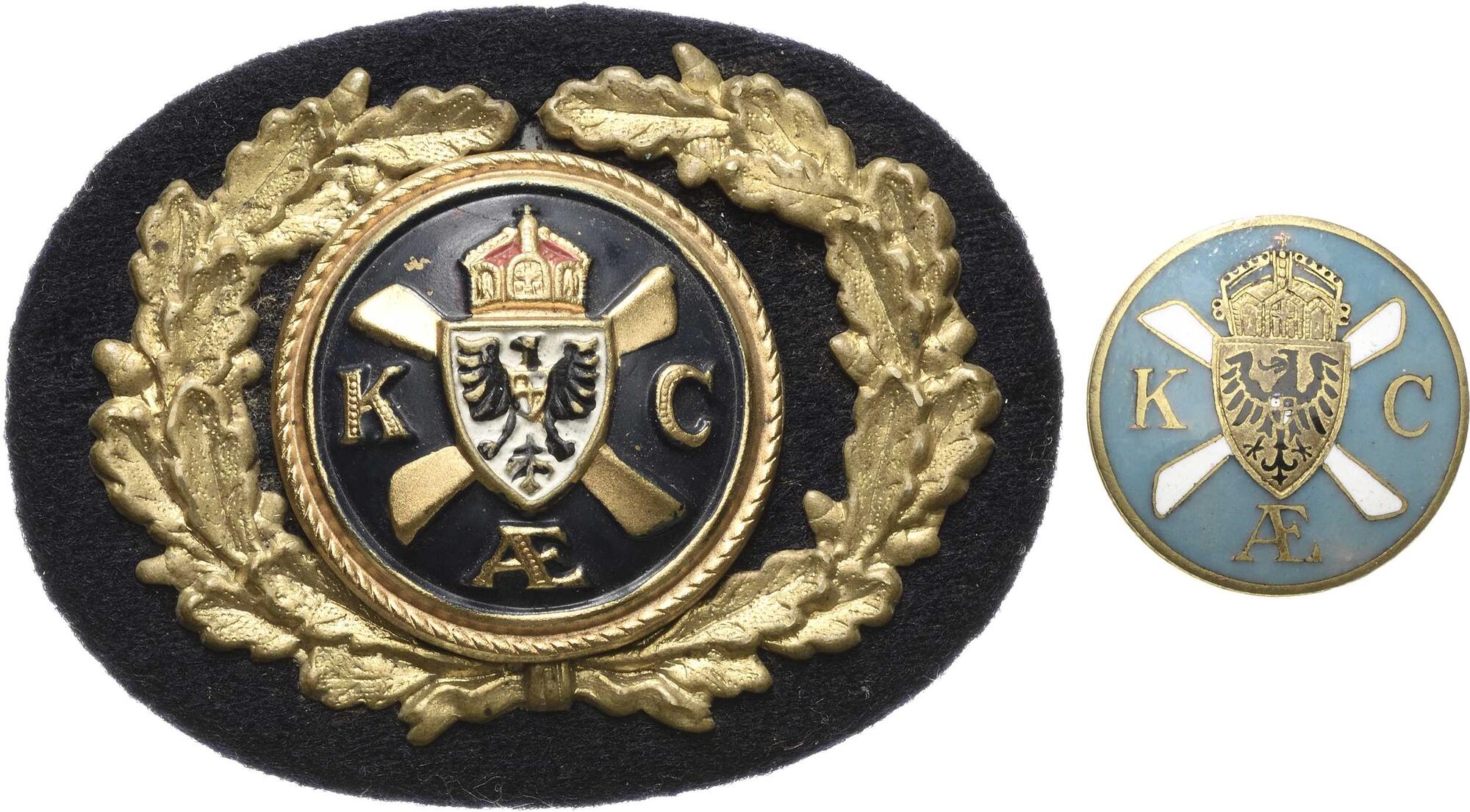 Stoffabzeichen auf Eisenblechunterlage o.J. (nach 1907). Kaiserlicher Aero-Club Österreich. Emblem im Eichenlaubkranz. 43,2 x 57,2 mm, 20,11 g. Rv. Nadel und Punze: DRGM 92612. Dazu: kleines emailliertes Bronzeabzeichen mit Knopflochbefestigung o.J. (Lauer) zu gleichem Anlass Slg. Joos b.291, b.292 Mey 1.1.019 Kaiser - 2 Stück. Vorzüglich