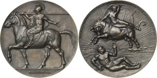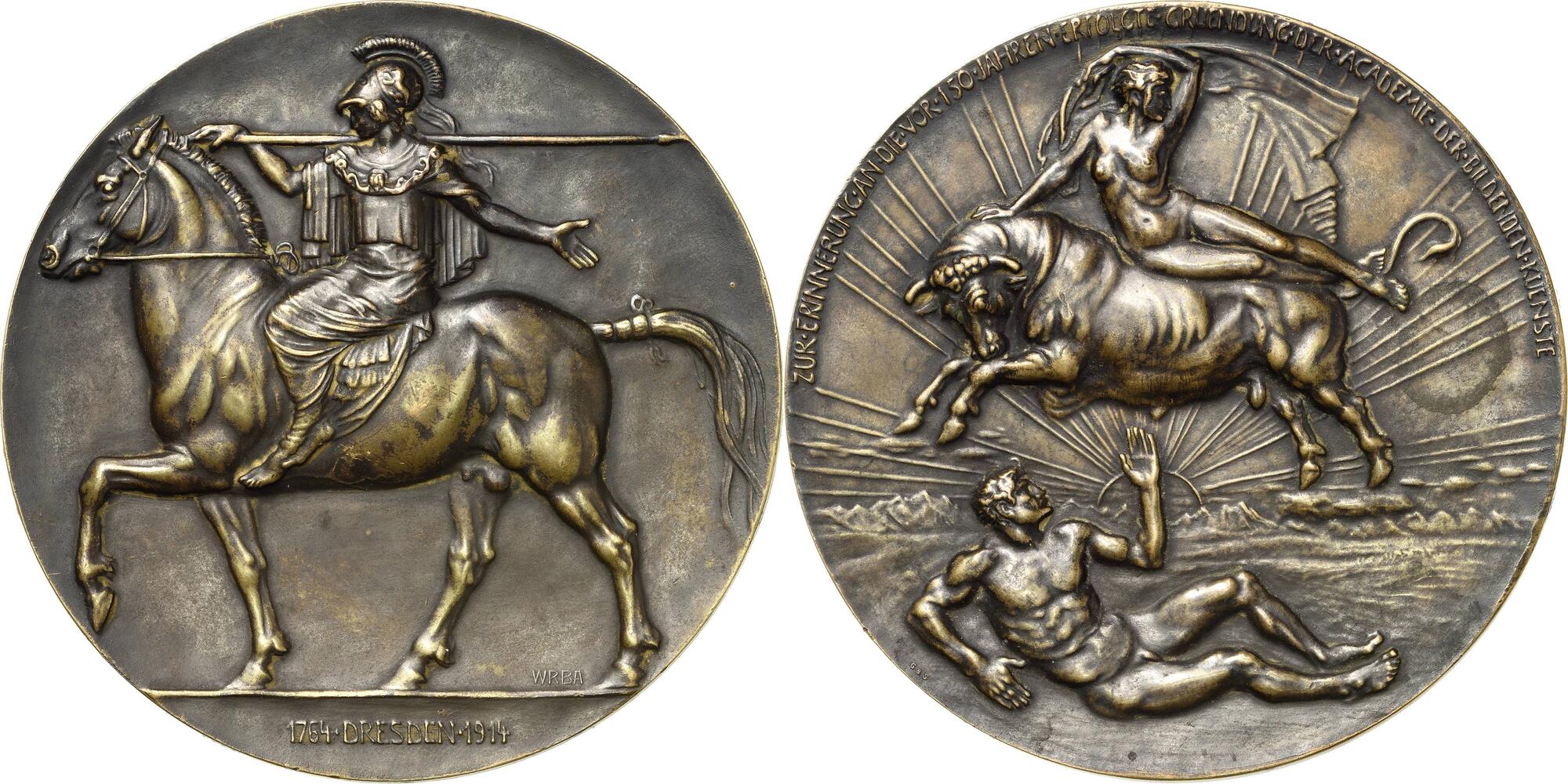 Große vergoldete Bronzegussmedaille 1914 (Georg Wrba/Glaser&Sohn) 150. Jahrfeier der Dresdner Kunstakademie. Athena mit geschultertem Speer reitet nach links / Unbekleidete Europa auf Stier nach links über am Boden liegendem unbekleideten Jüngling. 101,6 mm, 423,43 g Gebauer -, vgl. 1914.6 (versilbert) Hamburger Kunsthalle -, vgl. 1739 (76 mm, versilbert) Heidemann -, vgl. 825 (versilbert) Gereinigt, kl. Randfehler, kl. Bohrloch am Rand, kl. Flecke, vorzüglich