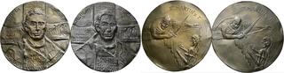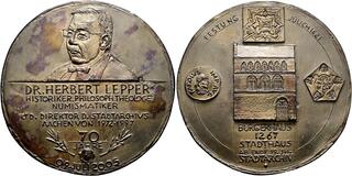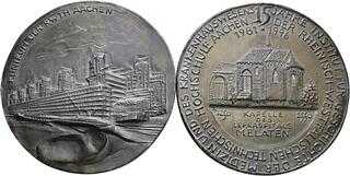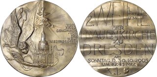 Güttler, Peter-Götz 1939-2024 Weißmetallgussmedaille 2005. 2. Weihe der Frauenkirche zu Dresden. Altarengel mit dem Modell der Frauenkirche in Händen von oben herabschwebend, im Feld über der Kuppel die Taube des Hl. Geistes und das Auge Gottes im Strahlenkranz, rechts im Feld 7 Zeilen Schrift / Mehrzeilige Inschrift auf leicht gewelltem Grund, im Abschnitt Kreuz, Anker und flammendes Herz (die Symbole von Glaube, Liebe und Hoffnung). Randpunze: G. 113,2 mm, 426,84 g DGMK 27 2005.23 Auflagenhöhe: 50 Exemplare. Fast gussfrisch