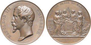 Rv. EXPOSITION. UNIVERSELLE. INTERNATIONALE. Au-dessus de Paris et des bâtiments de l'Exposition internationale, une Victoire volant et tenant une palme et une couronne, surmontée d'un homme en tablier tenant un flambeau ; dans le champ à droite la (date) et au-dessous signature J. C. CHAPLAIN ; à l'exergue, un cartouche avec l'attribution.