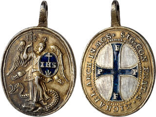 Germany. Oval Silver Medal, ND. 28.2 x 32.6 mm. 11.70g. Michaels-Pfennige, Moosburg. Partially enameled silver brotherhood pendant. Saint Michael the Archangel, holding a crucifix, a shield in blue enamel with the Christ monogram and nails on his left arm, standing on a dragon, wearing a stole with the letters F and P visible at both ends, crossed over his chest. Reverse; SIG CON FRAT S MICHAEL ARCH IN MOS. The blue cross on it reads FPFP within the inscription in a pearl oval. Tooling, Sent to PCGS, No Service. Our grade, Sharpness of Extremely Fine. Estimated Value $200 - 250