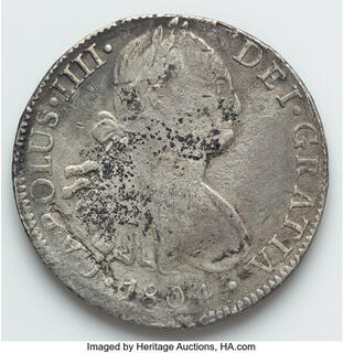 Belonging to the Dutch East India Company, the Hollandia met her demise during its inaugural voyage in July of 1743. Leaving the port of Texel with a convoy bound for Batavia in the Dutch East Indies, the Hollandia became lost in dense fog around the Scilly Islands. It struck rocks a few kilometers outside the island of Annet, but after firing cannons and unsuccessfully alerting locals, the entirety of the 276-member crew and its treasure perished. The cargo it carried contained several barrels filled with silver coins worth approximately 129,000 florins. Many were Spanish issues of four and eight Reales that were minted in Mexico and Bolivia, hardly having time to circulate before the tragedy. Some of the rarer issues included Mexican "Klippes" (1733-1734), Cobs from Guatemala, and Ducatons from the Netherlands. These coins, and many more artifacts, were found and recovered over 200 years later in 1971 by London explorer Rex Cowan. Cowan, and a team of divers, archeologists, and specialists, began an archeological excavation that covered 180 meters by 100 meters. In two years, over 35,000 silver coins and bronze artifacts were recovered, with most coins being Mexican eight Reales "columnarios" (silver coins that feature the column motif, minted in Spain from 1732-1773). www.HA.com/TexasAuctioneerLicenseNotice
