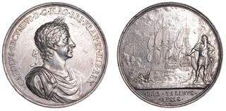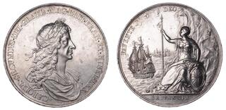 Peace of Breda [1667], a silver medal, unsigned [by J. Roettier], laureate and draped bust of Charles II right, rev. Britannia seated left on shore, holding spear and resting left hand on shield, ship to left, edge carolvs secvndvs pacis et imperii restitvtor avgvstvs, 57mm, 77.45g (MI I, 535/186; Pax 271; E 241). Some scuffing and surface marks, otherwise very fine, bright appearance £400-£500