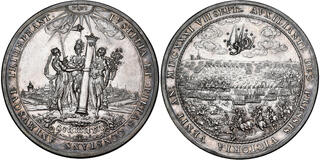 | Lot description: Medals Foreign Medals - SWEDEN'S VICTORY AT BREITENFELDT OVER THE AUSTRIAN ARMY SEPTEMBER 7TH 1631, by by Sebastian Dadler., SWEDEN Justitia, Pietas, and Constantia around a crowned column, in the distance a cityscape of Leipzig, below which, in praise of SKM 38b; Dassd. 726; Hild. 28; Wieçek 72.Ex Cherry Tree Collection. The Battle of Breitenfeld in 1631 marked a decisive turning point in the Thirty Years' War and transformed the fortunes of the Protestant cause. Until this moment, the Catholic League under Count Tilly had enjoyed a long stretch of victories, leaving Protestant states weakened and demoralized. When Gustavus Adolphus of Sweden entered the conflict, he brought with him a modern, highly disciplined army whose tactical innovations would reshape the battlefield. At Breitenfeld, the combined Swedish and Saxon forces faced Tilly's seasoned Imperial army. Although the Saxons broke early under attack, the Swedish lines held firm. Gustavus Adolphus's flexible formations, effective integration of infantry, cavalry, and mobile artillery, and his ability to exploit the enemy's rigid tercio structure proved decisive. A sweeping Swedish cavalry maneuver on the Imperial flank shattered Tilly's cohesion and turned the battle into a devastating victory. This triumph did more than defeat an army-it revived the Protestant war effort. Breitenfeld ended the aura of Catholic invincibility, restored confidence among Protestant states, and opened central Germany to Swedish advances. From this point onward, the conflict's momentum shifted dramatically, making Breitenfeld the moment when the future of the Protestant cause changed.AR 75 mm. 58.87 g. R. Choice. PCGS MS61. Estimate: 3000 EUR |