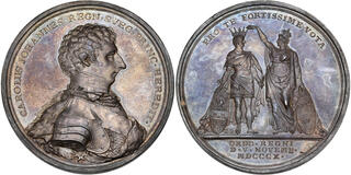 | Lot description: Medals Foreign Medals - ADOPTION OF KARL XIV JOHAN AND ELEVATION TO CROWN PRINCE 1810, by by C. Enhörning., SWEDEN Cuirassed bust right. Rev. king standing left, crowned by personification of Sweden.SKM 6a. Hild 4.Ex Cherry Tree Collection. In 1810, the aging and childless Karl XIII of Sweden adopted Jean Baptiste Bernadotte, a French marshal, who became Crown Prince Karl XIV Johan. The sudden death of the previous heir left Sweden in urgent need of a strong successor, and Bernadotte's military reputation, administrative skill, and good standing among Swedish officers made him a compelling choice. After election by the Riksdag, Karl XIII formally adopted him on 21 August 1810. This decision stabilized Sweden during a turbulent period and ultimately founded the Bernadotte dynasty, which continues to rule Sweden todayAR 58mm. 77.43 g RR. Choice. PCGS MS64. Estimate: 1500 EUR |