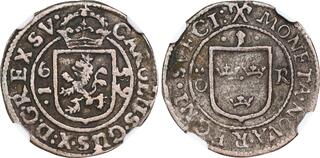 | Lot description: SWEDEN. Öre, 1659. Stockholm Mint. Karl X Gustav. KM-212; SM-32A; Delzanno-32; Bruun-12118. Nice example of this very rare sub-type with the crossed arms mintmark and without the moneyer's initials below the denomination. From the L. E. Bruun Collection. Ex: Countship of Brahesminde Collection (Private Sale - 1922). Estimate: 400 - 600 |