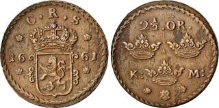 | Lot description: SWEDEN. 2.5 Öre, 1661. Avesta Mint. Karl XI. NGC AU-50 Brown. KM-235; SM-336; Bruun-12141. Weight: 45.12 gms. Scarce one-year type. High grade with a sharp strike and a nice brown toning. The highest denomination of Öre copper coin struck. From the L. E. Bruun Collection. Ex: Countship of Brahesminde Collection (Private Sale - 1922). Ex: Leopold Welzl von Wellenheim Collection (Vienna - 1846) Lot # 10190. Estimate: 1000 - 1200 |