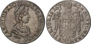 | Lot description: SWEDEN. Pomerania. 1/3 Taler, 1674-DS. Stettin Mint. Karl XI. NGC EF-45. KM-260; SB-127; DelzNNO-813; Bruun-12319. Weight: 8.74 gms. Nice example with remaining traces of luster, especially in the reverse legend. From the L. E. Bruun Collection. Ex: Countship of Brahesminde Collection (Private Sale - 1922). Estimate: 120 - 140 |